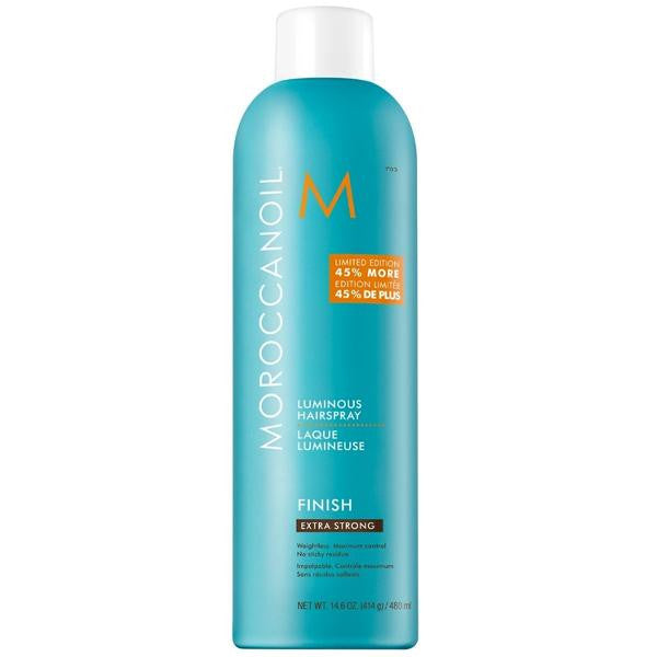 Our extra strong, finishing hairspray provides long-lasting hold for the most demanding hairstyles. Moroccanoil® Luminous Hairspray Extra Strong is the ultimate setting hairspray that secures special-event styles: from sleek ponytails to chignons to red-carpet looks. This high-performance, argan oil-infused extra hold formula veils hair in a reflective shield of shine that fights humidity and frizz, yet brushes out easily and leaves no sticky residue.